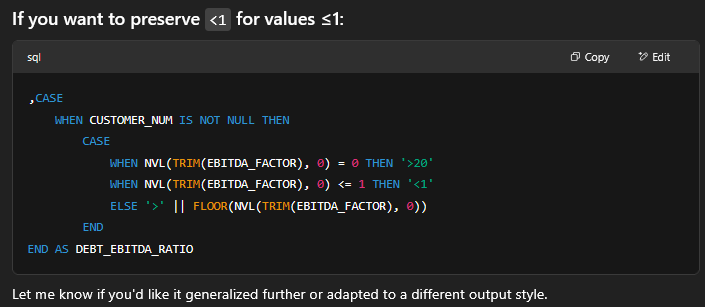 GitHub Copilot (GPT-4o): Yes, the condition WHEN NVL(EBITDA_FACTOR, 0) < 1 THEN '<1' does indeed cover the case WHEN NVL(EBITDA_FACTOR, 0) < 0 THEN '<1'.